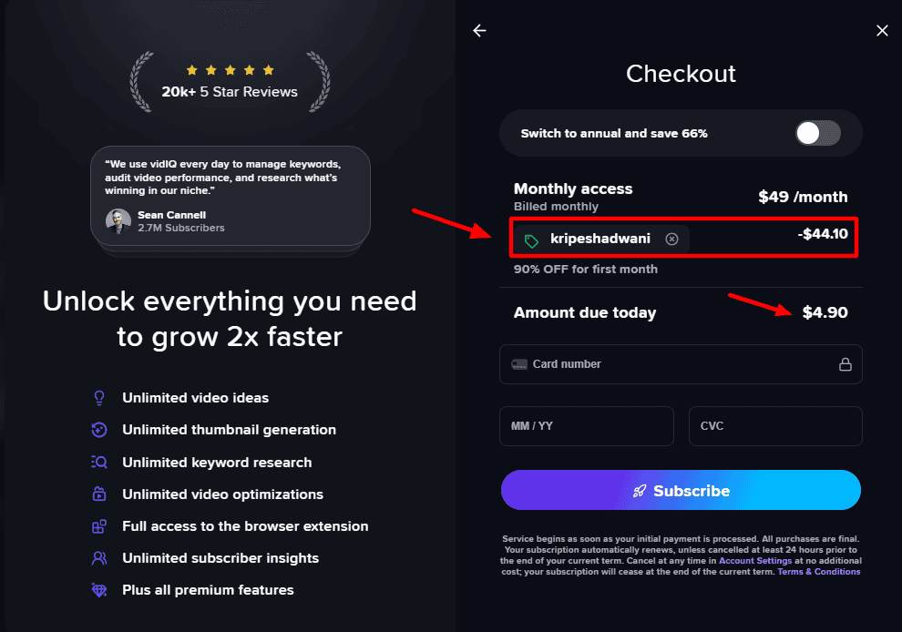 VidIQ Boost plan is priced at $24.50/month, which is quite expensive considering the features it offers. However, with my coupon code, its pricing is significantly reduced.