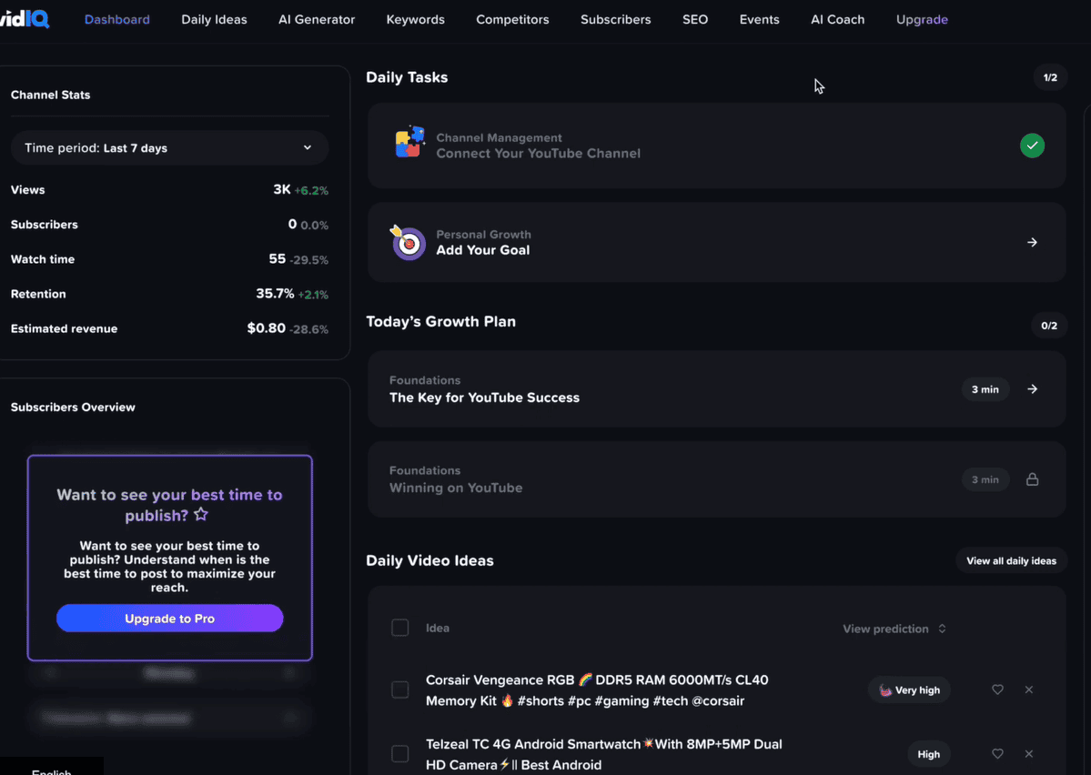 The Pro plan lets you connect 1 YouTube channel. It gives you access to 10 daily AI video ideas, keyword research and discovery tools, along with competitor tracking, and other tools for $5.98/month.