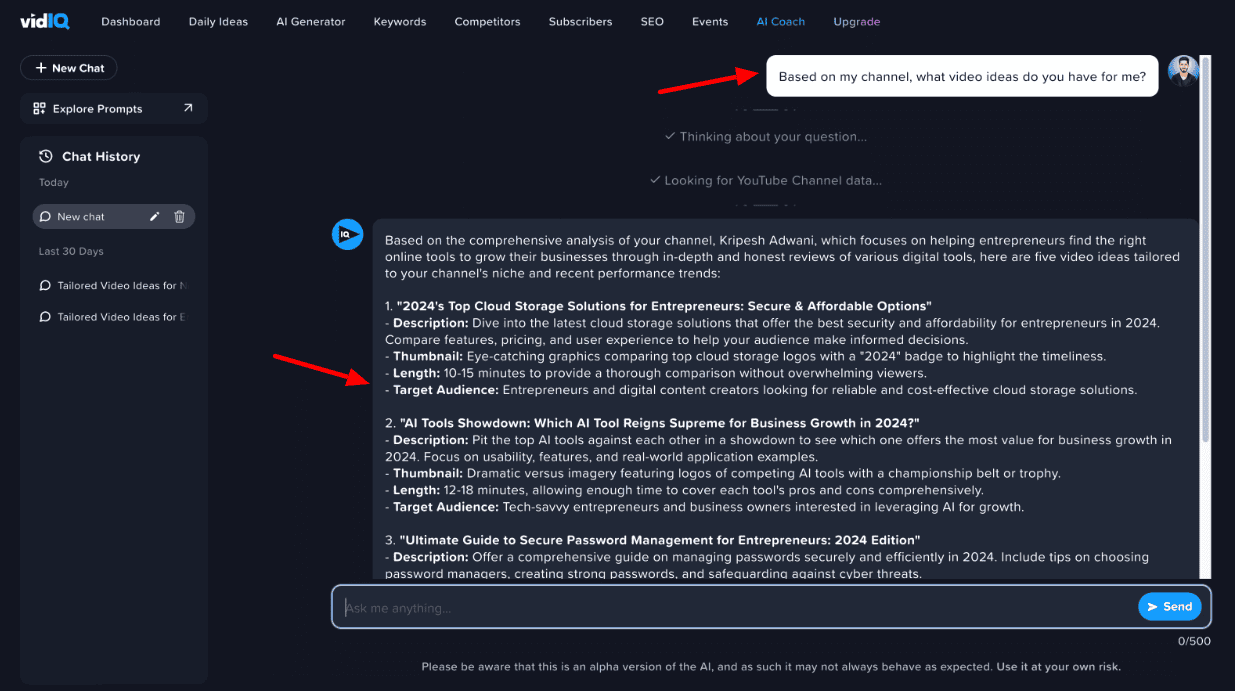 VidIQ’s AI Coach integrates ChatGPT to answer basic video-related questions for you. For instance, you can use it to get video ideas, summarize any video, analyze the hook, or ask custom questions.