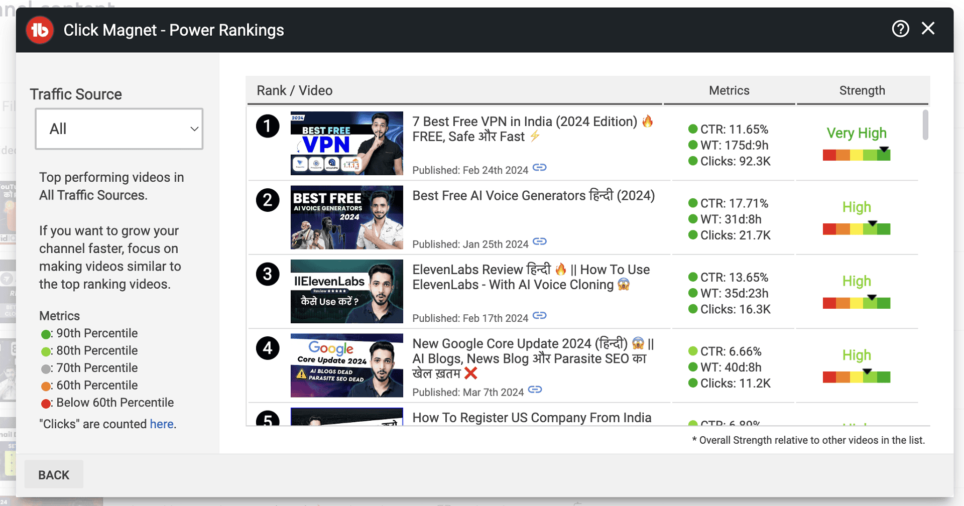 It offers you helpful insights into what type of videos you should create based on certain factors. You can check out your top-performing videos with their CTR, clicks, and overall strength.