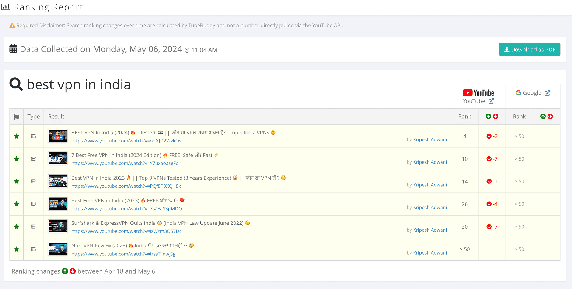The Ranking Report helps you monitor your search position for the keywords chosen. It scans through Google and YouTube and shows how your video’s rank changes for a particular keyword. It’s great for analyzing your performance and constantly improving your video content.