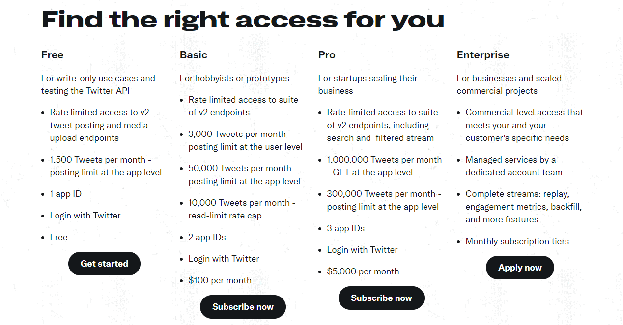 Twitter has recently hiked up the prices for its API, where you get the Basic plan offering 50k tweets/month for $100/month Whereas, their Pro plan offering 1 million tweets/month is priced at $5000/month!