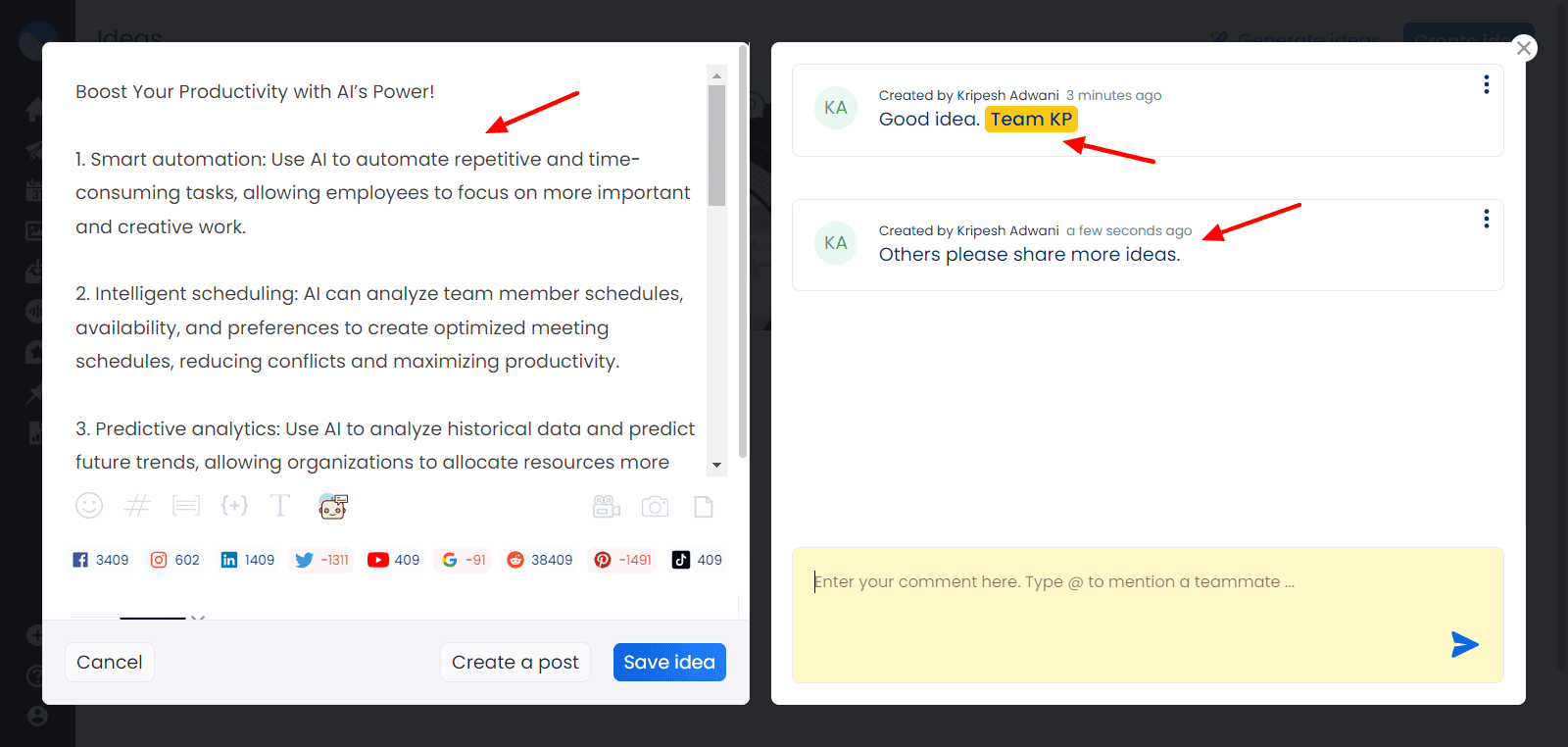 Under the Ideas section, you can explore different ideas for your upcoming posts. This is quite valuable if you have a team of users. You can collaborate with them and collect multiple ideas for your next posts as comments.