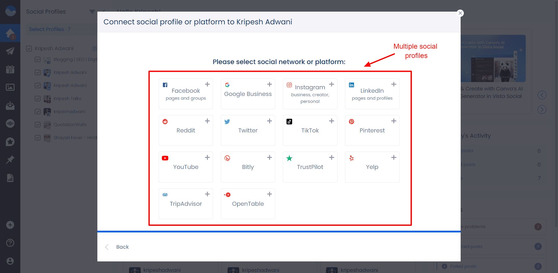 Vista Social is an All-in-One Social Media Management Tool. It not only helps you create and schedule posts, but also manage comments, plan posts, and track your performance across various social profiles.