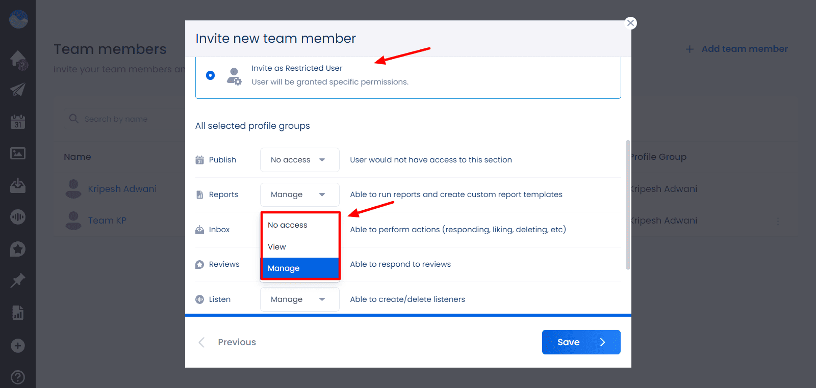 For a restricted user, you can manually select your preferred profile groups and assign a view or manage access to them. This is a pretty good security feature for exercising better control over your social media platforms.