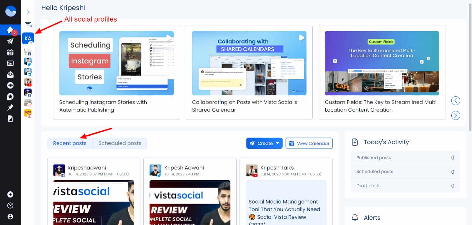 You can click on any profile to view the recent and scheduled posts on it. On the extreme left panel, you’ll find a list of all the functions you can perform on Vista Social. Overall, I like its user-friendly interface and its modern dashboard.