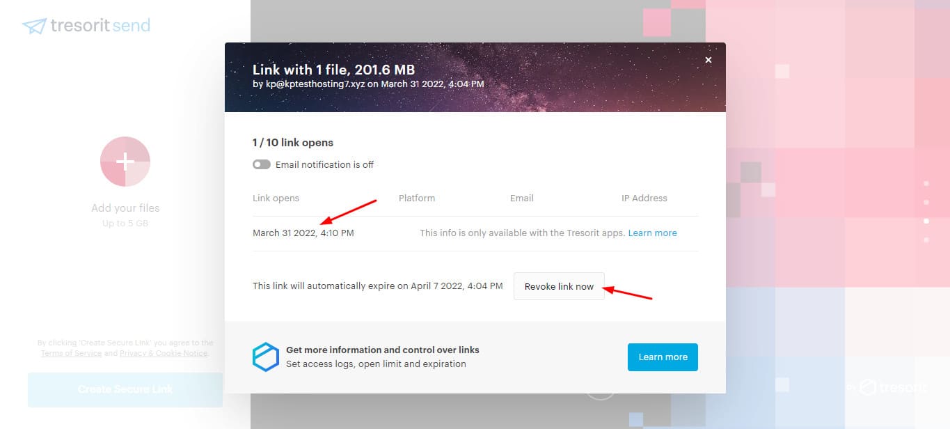 If enabled, the auto-destruct option automatically deletes your shared file when it is downloaded by the recipient. If it is shared with multiple recipients, they delete the file after it’s downloaded by all recipients.