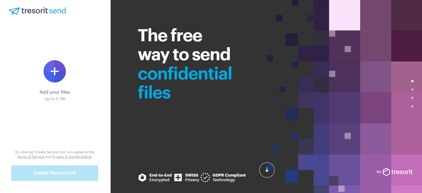 Tresorit Send is a security-first file transfer service offered by Tresorit Cloud storage. With this service, you can share up to 5 GB of files without signing up for an account. If your priority is the security of your data, Tresorit Send is the best option for you!