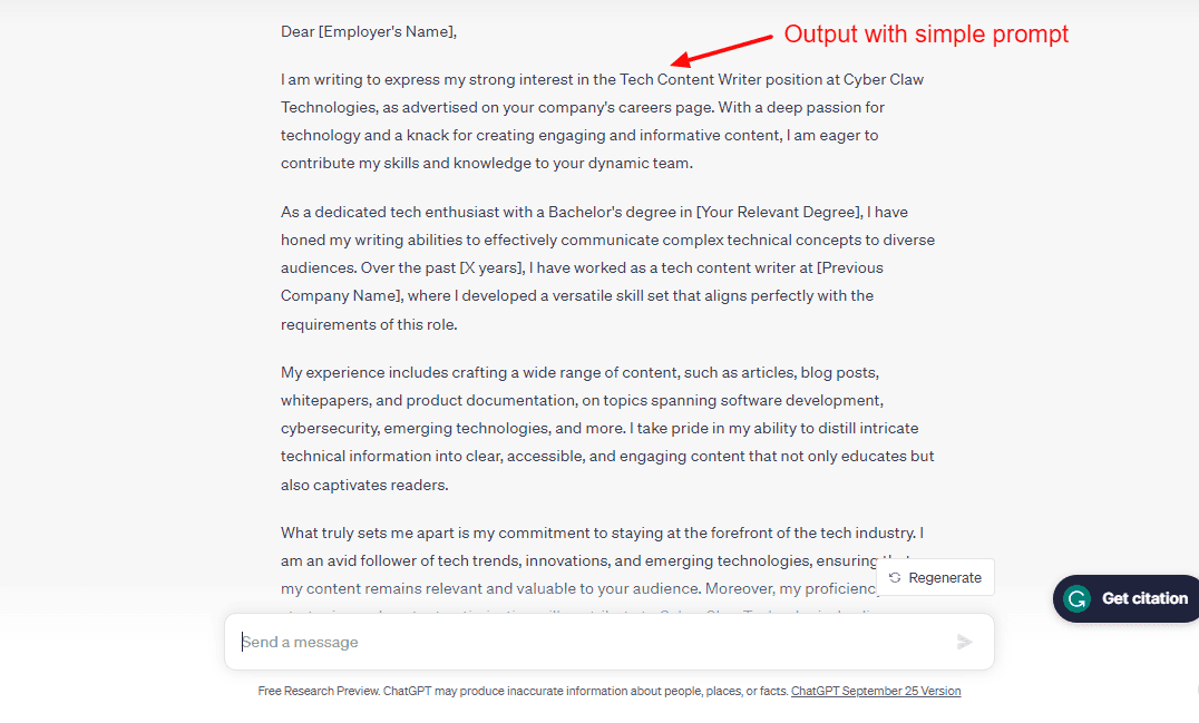 Let’s understand how to write a good prompt with the help of a simple example. For instance, you want to write a cover letter for applying to a job as a tech content writer. Here’s a basic prompt most people would write.