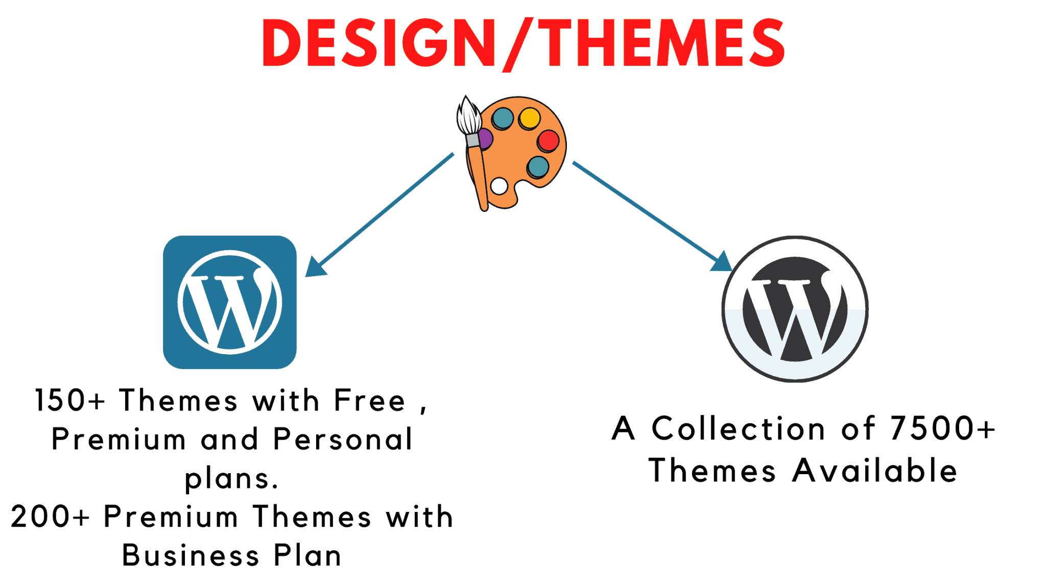 With a free WordPress.com account, you get access to a limited number of themes (150+ free themes) and there are not many features for customization like editing or adding custom code or uploading custom themes.
