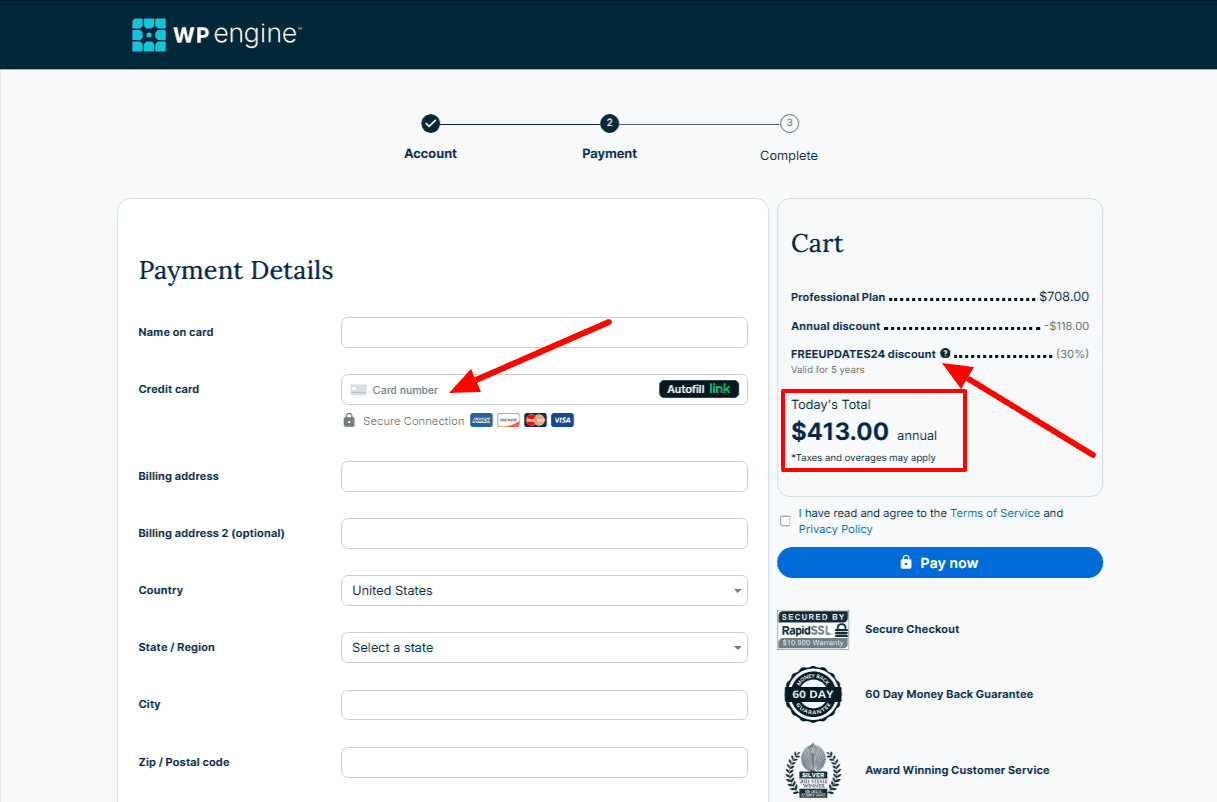 Finally, you will be forwarded to the payment page, where you need to provide your card details, billing address, etc. This is how you can easily avail of WP Engine’s Black Friday Deal!