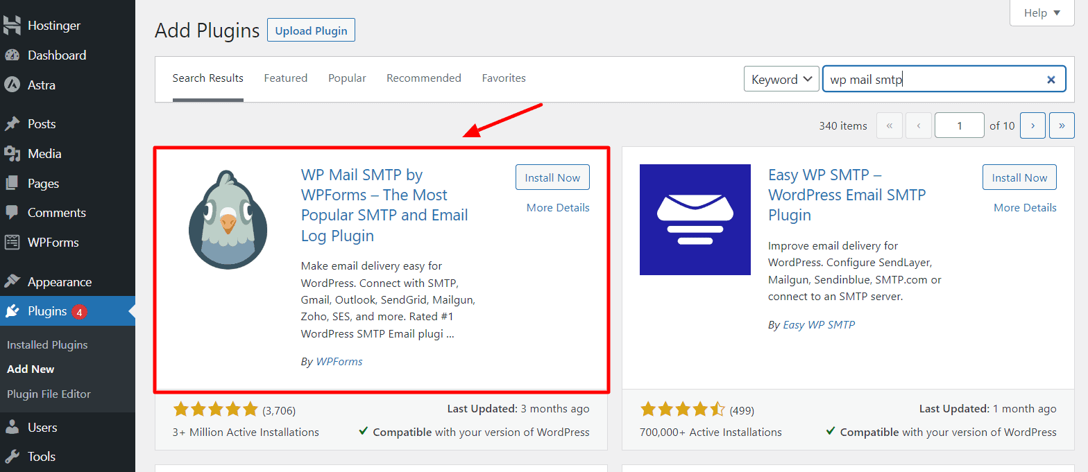 First, log in to your WP-admin area and go to the Plugins tab. Search for the WP Mail SMTP plugin and hit the Install button beside it.