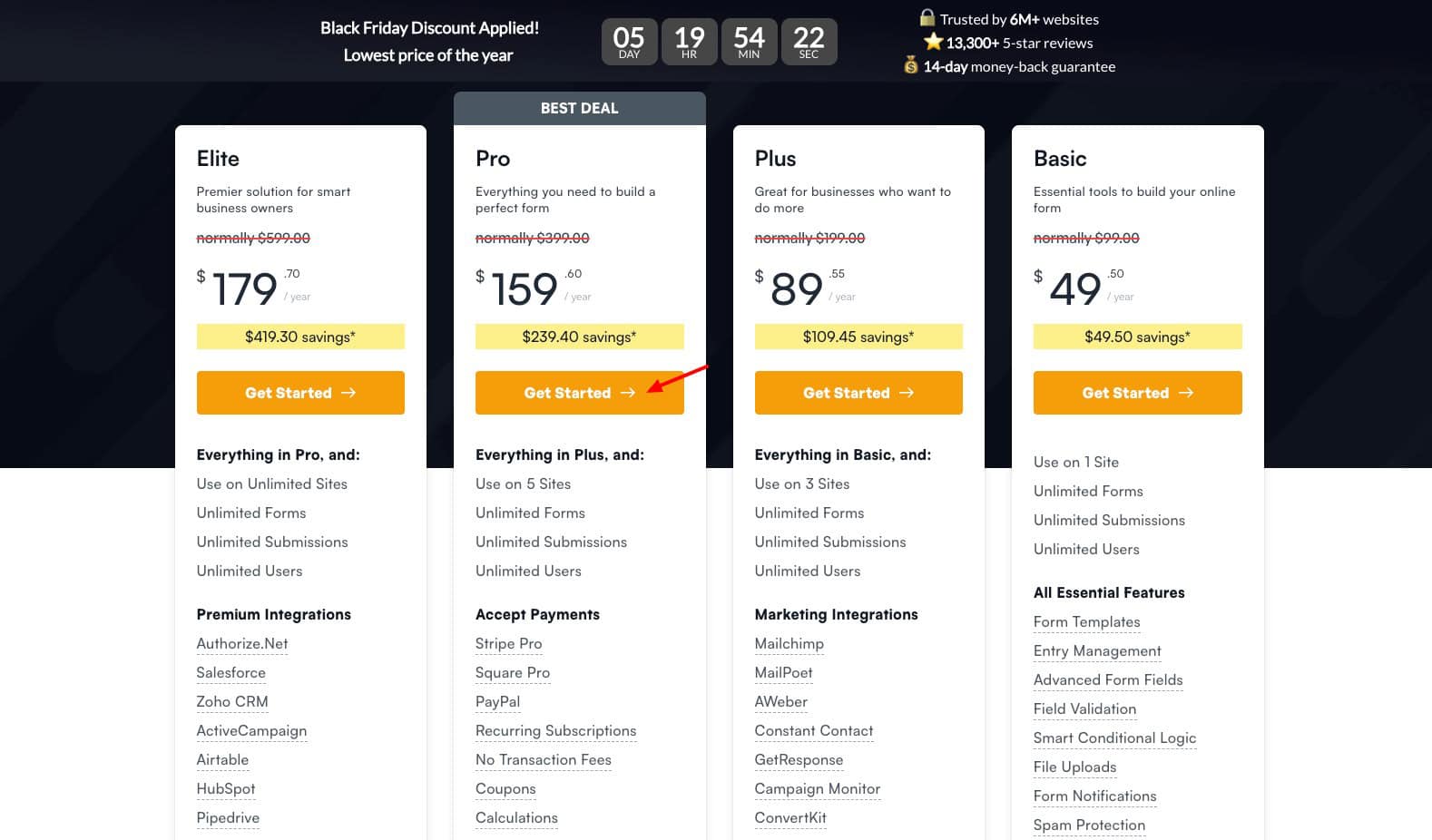 Their Pro plan is the recommended plan as it lets you connect 5 sites, allows unlimited forms, submissions, and users, and offers advanced form features, conversion tools, and advanced add-ons.