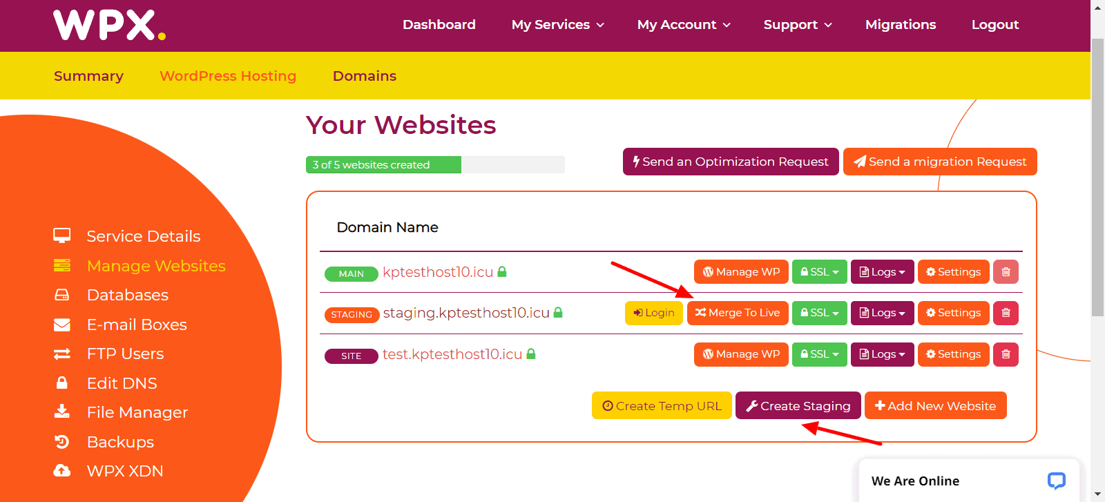 Creating a staging website on WPX is easy. It takes a few minutes to deploy your staging environment. And if you want to push the changes to the live website, you can do so by simply pressing the merge to live button.