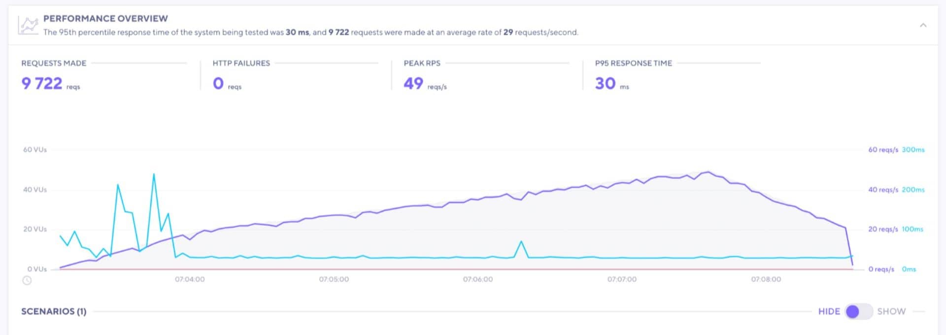 WPX hosting handles load tests really well with a stable response time, no major spikes in response time, and no request failures. It could be a good option for handling medium to large-traffic websites.