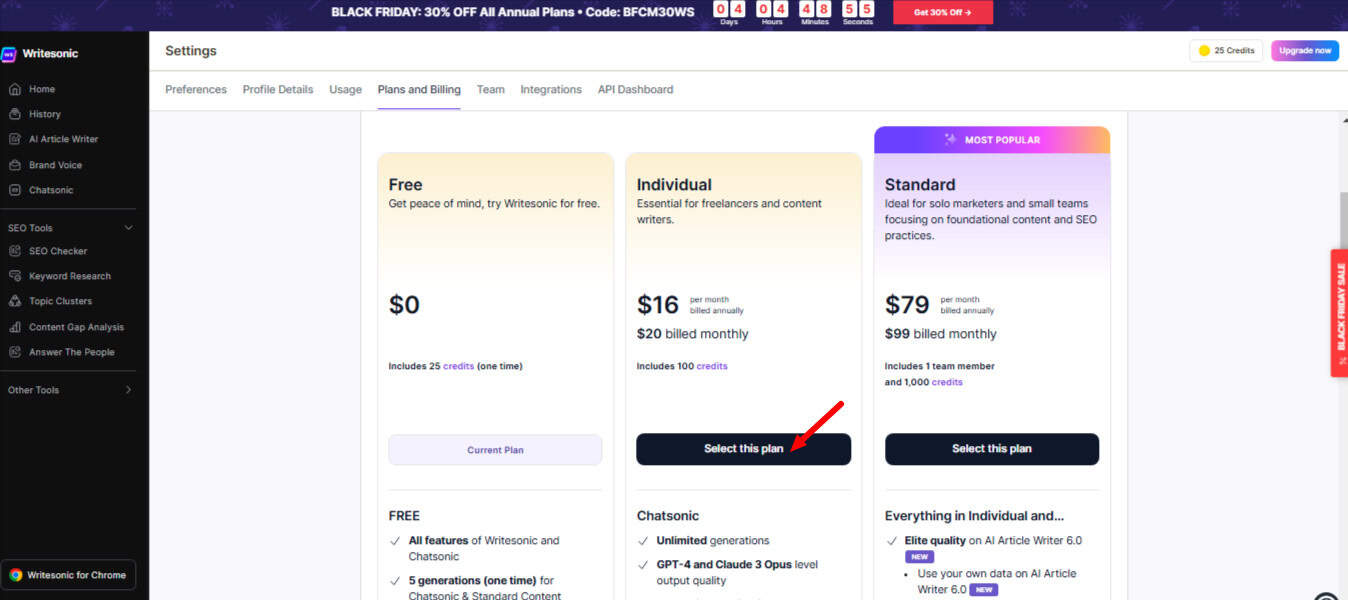 Writesonic offers 2 major pricing plans for Individuals and Freelancers: Individual and Standard plan.