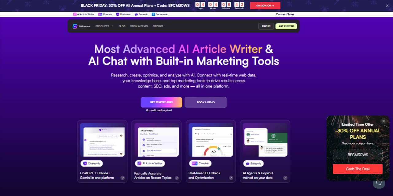 The promo code for Writesonic’s Black Friday Deal is BFCM30WS.