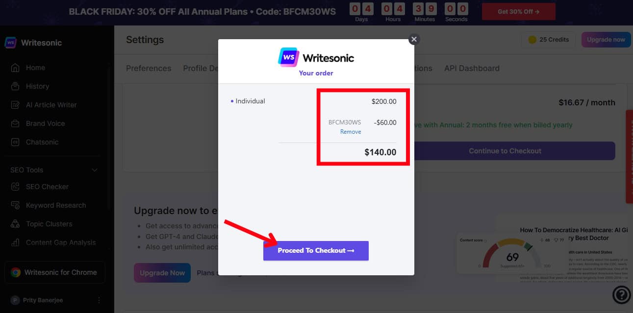 For Writesonic Black Friday Deal for, they are offering annual plans for 30% discounted prices. So, you can purchase its Starter plan now for $140/ yearly. In my experience, investing in Writesonic would be worth it for content writers, copywriters, bloggers, and marketing teams.